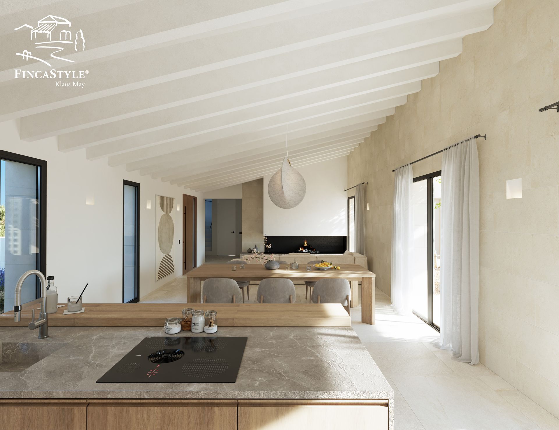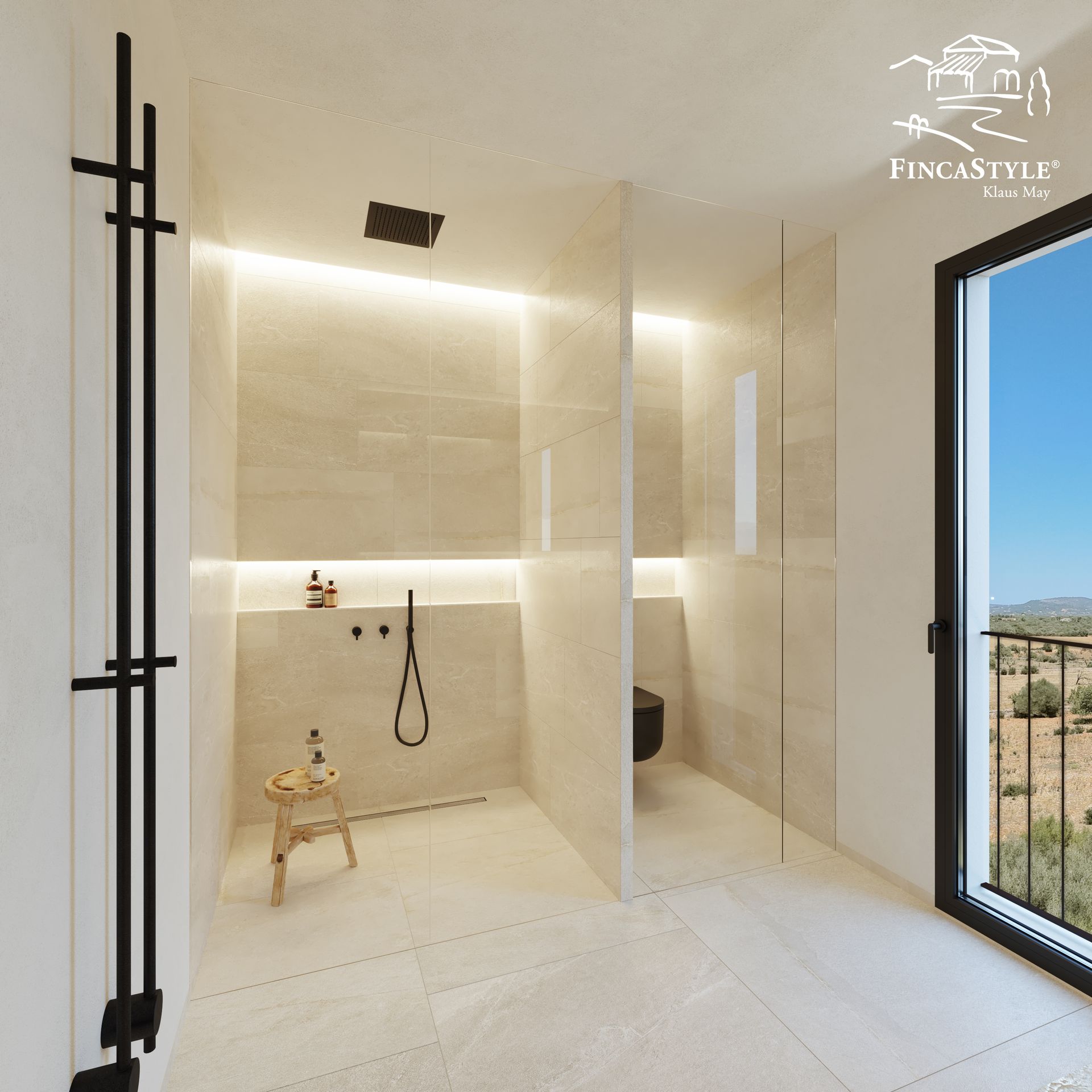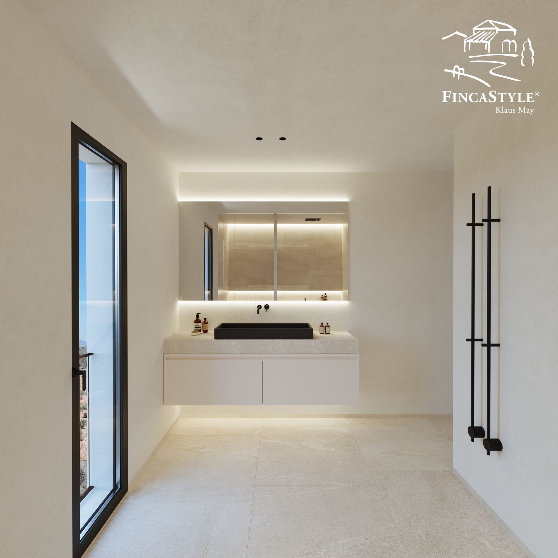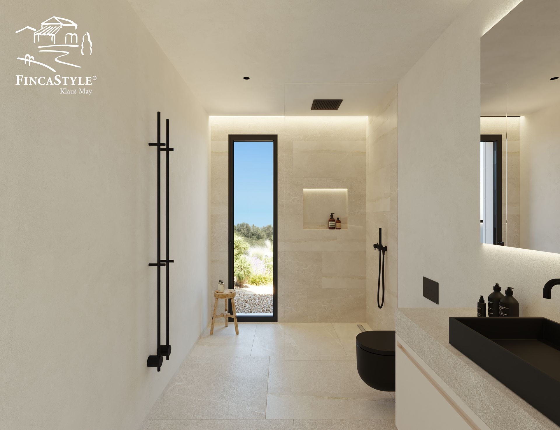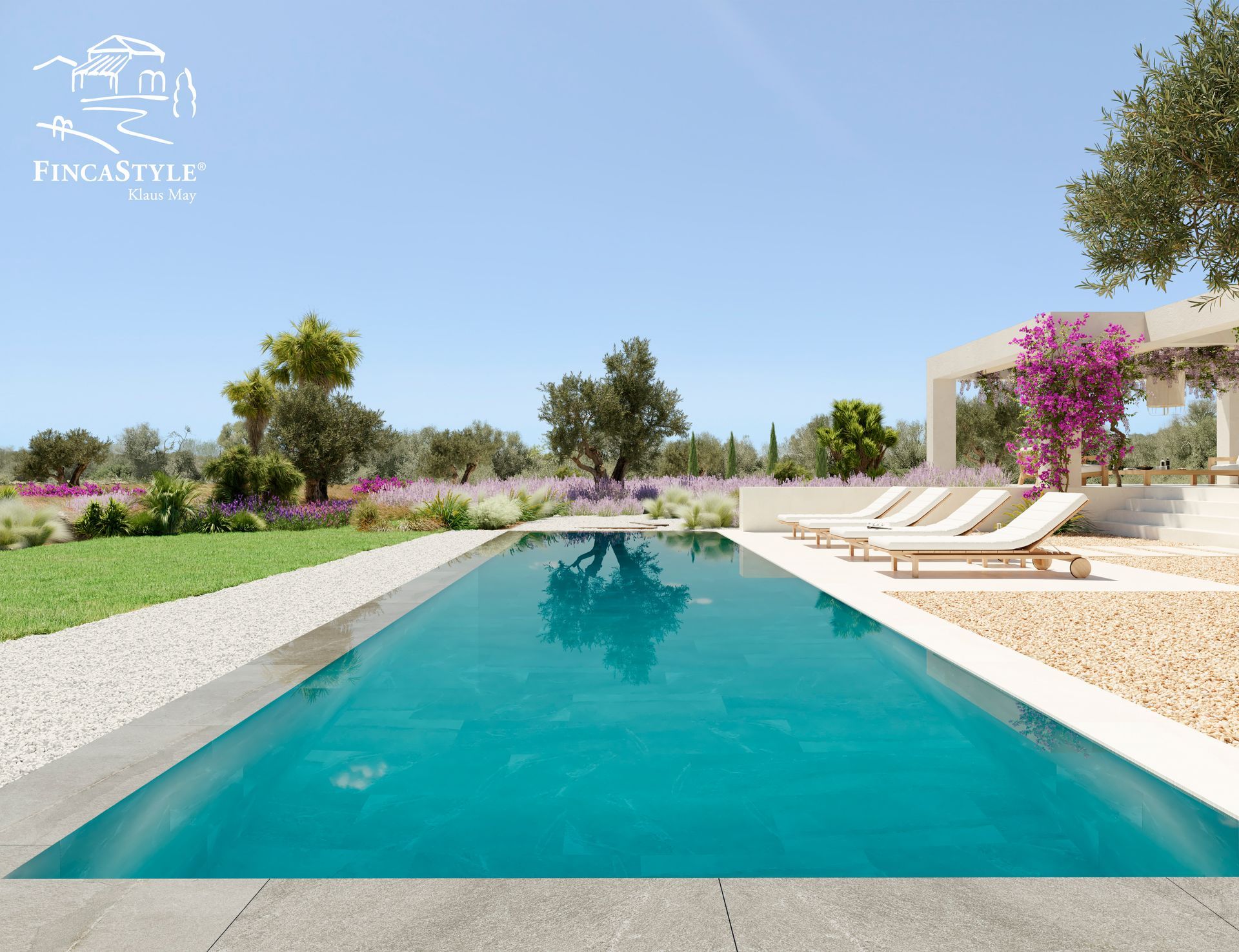 Equipped with state-of-the-art amenities, solar energy, central air conditioning, and underfloor heating with individual room control, domotic system, LED lighting concepts, heated saltwater infinity pool, built-in wardrobes, video surveillance, alarm system, heat pumps, natural stone walls, exterior Mallorcan shutters, carport for 2 cars, private long driveway, and garden design, this Fincastyle® ensemble becomes a unique timeless dream finca. The most modern sustainable architecture is understood at Fincastyle®.