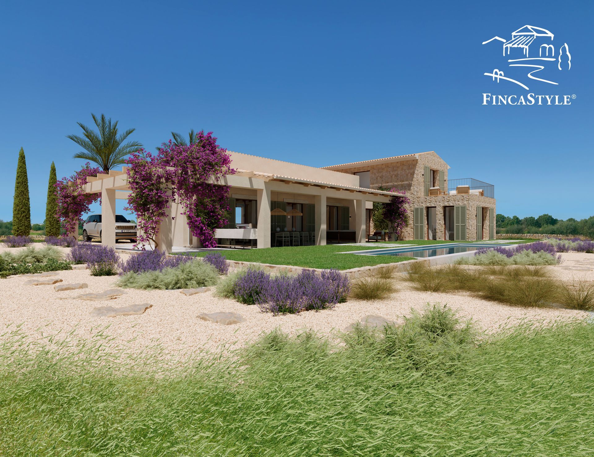 Equipped state of the art, this project is conceived as a contemporary luxury finca with photovoltaic system, heat pump, central air conditioning, and underfloor heating with individual room control, home automation system, LED lighting concepts, heated salt infinity pool, high-quality built-in elements, natural stone and solid wood features, as well as exterior Mallorquinas. Sustainable architecture, high-quality materials, and cutting-edge technology are understood as the FINCASTYLE® standard.