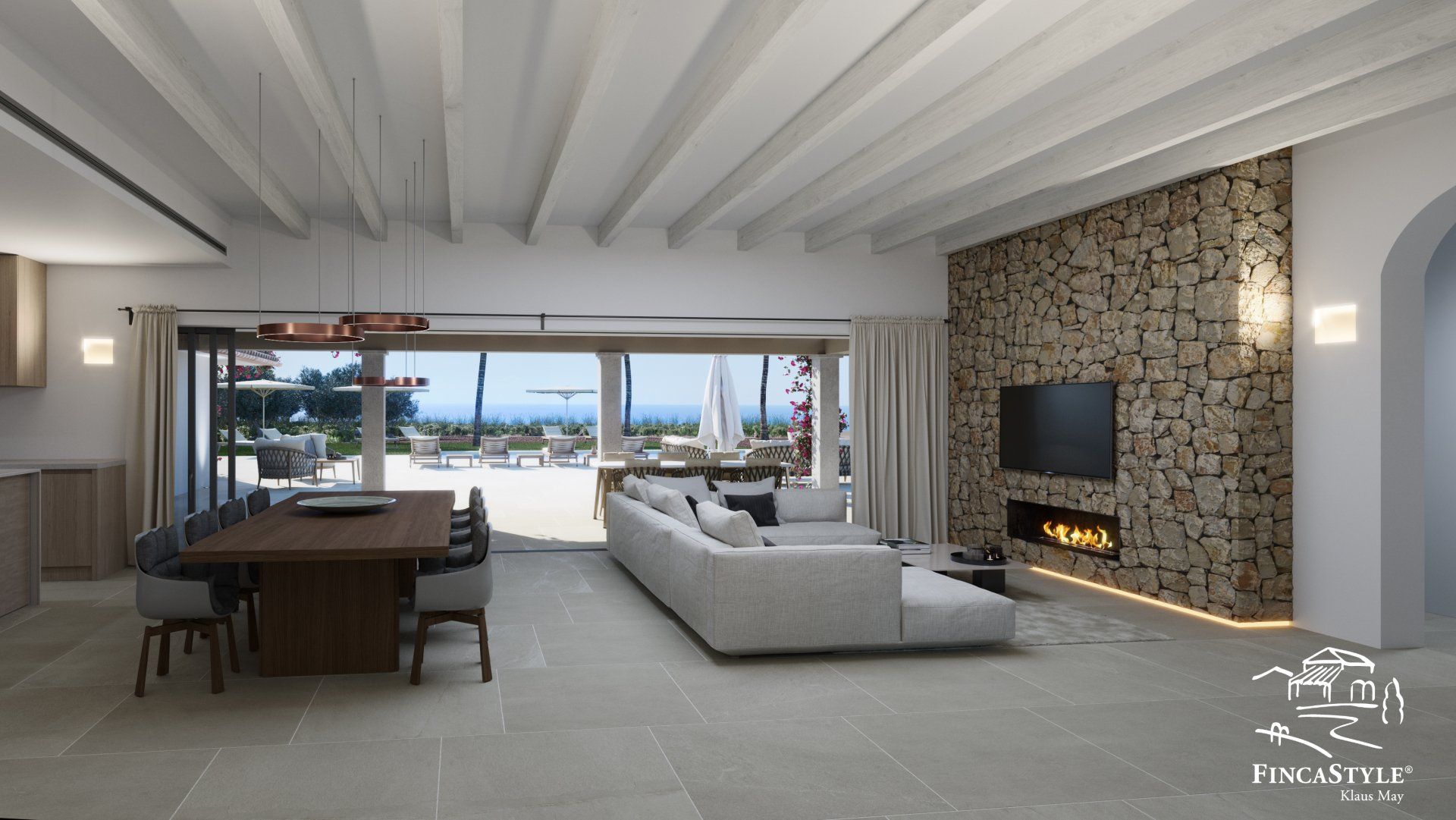 Ihre Finca bietet einen großen Salon, welcher sich zur Poolseite komplett öffnet mit Kamin und offener perfekt ausgestatteter Küche und Hauswirtschaftsraum.